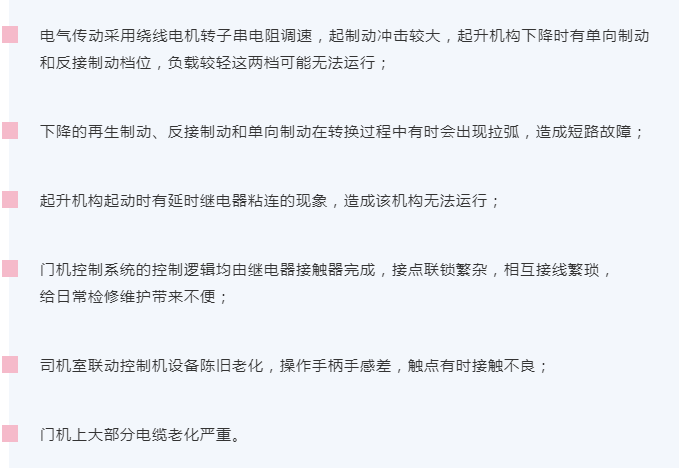 金銀臺(tái)樞紐1250T雙向門(mén)機(jī)電氣控制系統(tǒng)于2012年投運(yùn)至今已有8年,控制系統(tǒng)元器件老化,部分元器件已停產(chǎn),無(wú)法提供備件,控制線路老化,可靠性降低,影響設(shè)備安全運(yùn)行,無(wú)法滿足設(shè)備安全生產(chǎn)的需要。原控制系統(tǒng)設(shè)計(jì)性能差,操作系統(tǒng)容易出故障,啟動(dòng)沖擊較大,平穩(wěn)性差。據(jù)現(xiàn)場(chǎng)調(diào)研主要存在以下問(wèn)題:
